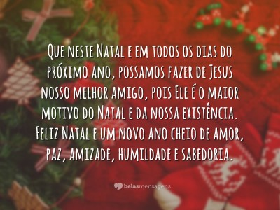 Que neste Natal e em todos os dias do próximo ano, possamos fazer de Jesus nosso melhor amigo, pois Ele é o maior motivo do Natal e da nossa existência. Feliz Natal e um novo ano cheio de amor, paz, amizade, humildade e sabedoria.