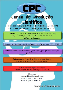 Estão abertas as inscrições para o Curso de Produção Científica – CPC, que acontecerá nos dias 12 e 13 de Novembro, no Auditório do Colégio Técnico de Teresina – CTT/UFPI.