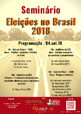 No dia 04 de setembro teremos o Seminário Eleições no Brasil 2018. As inscrições são gratuitas por meio do seguinte link: https://goo.gl/forms/nWIcwhvHNl9gQi7G2  Para a obtenção do certificado, é necessário participar de, pelo menos, 75% da carga horária do evento. O evento é coordenado pelo prof. Vítor Sandes, por meio do Programa de Pós-graduação em Ciência Política - UFPI, com apoio do Grupo de Pesquisa sobre Partidos Políticos (GEPPOL), da Associação Brasileira em Ciência Política - Regional Nordeste (ABCP-NE) e da Coordenação do Curso de Bacharelado em Ciência Política.