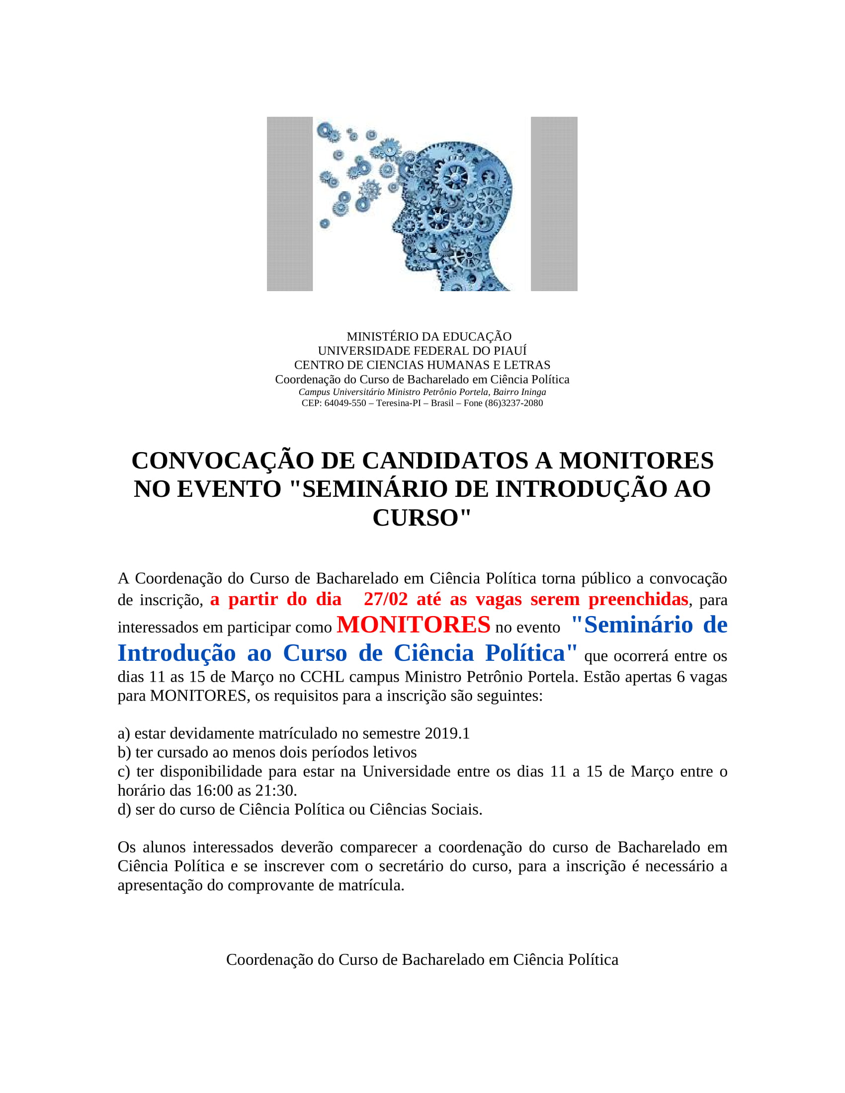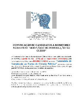 Convocação de Monitores para o evento: "SEMINÁRIO DE INTRODUÇÃO AO CURSO DE CIÊNCIA POLÍTICA".