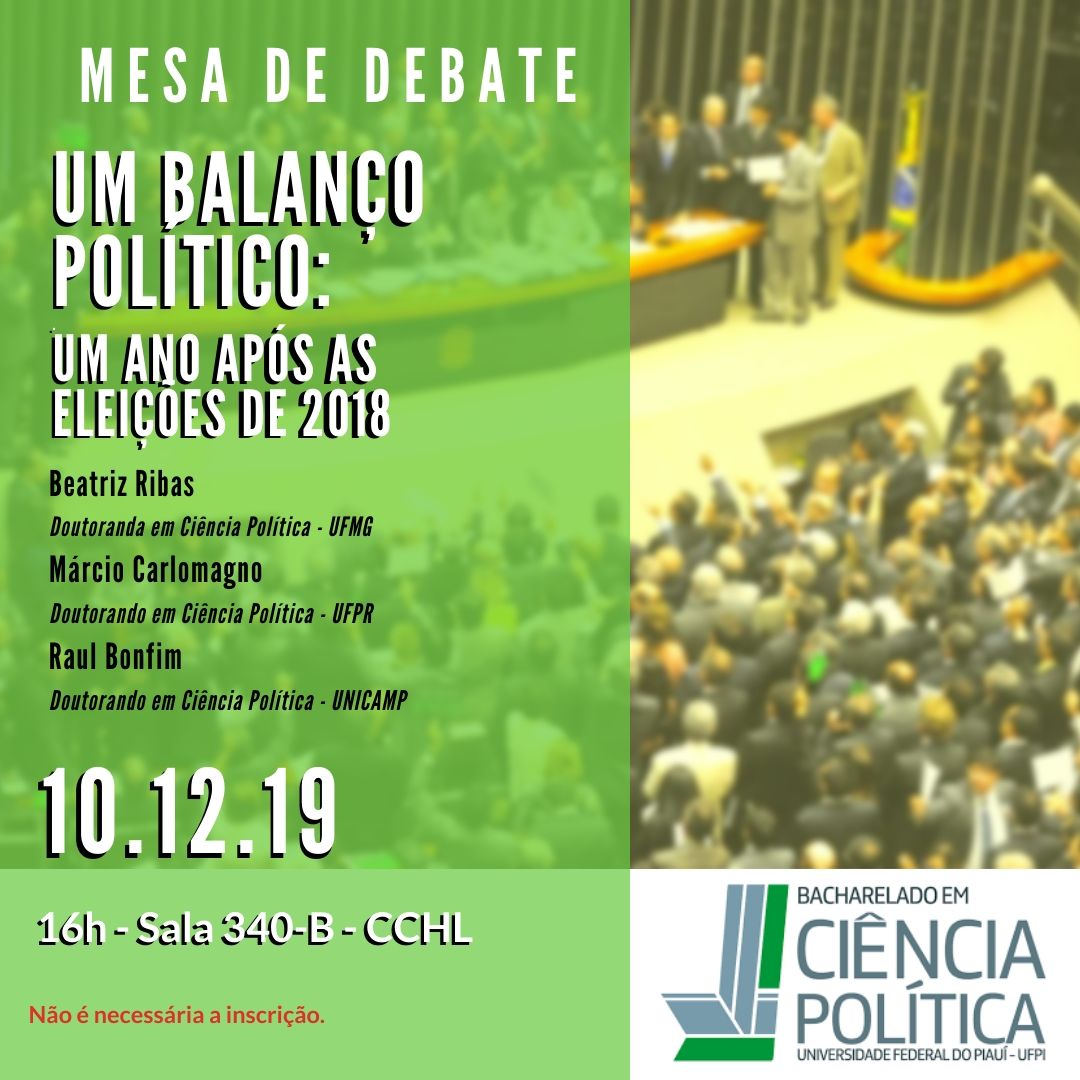 Acontecerá no dia 10 de dezembro, terça-feira, às 16h, na sala 340-B do CCHL, a mesa de encerramento do semestre e do ano letivo do Curso de Bacharelado em Ciência Política da UFPI. A mesa terá como tema: "Um balanço político: um ano após as eleições de 2018" (cartaz em anexo) e contará com a participação de dois professores do Curso, a professora Beatriz Ribas e o professor Márcio Carlomagno, que também são doutorandos em Ciência Política (na UFMG e na UFPR, respectivamente) e também terá a participação do doutorando em Ciência Política pela UNICAMP, Raul Bonfim.