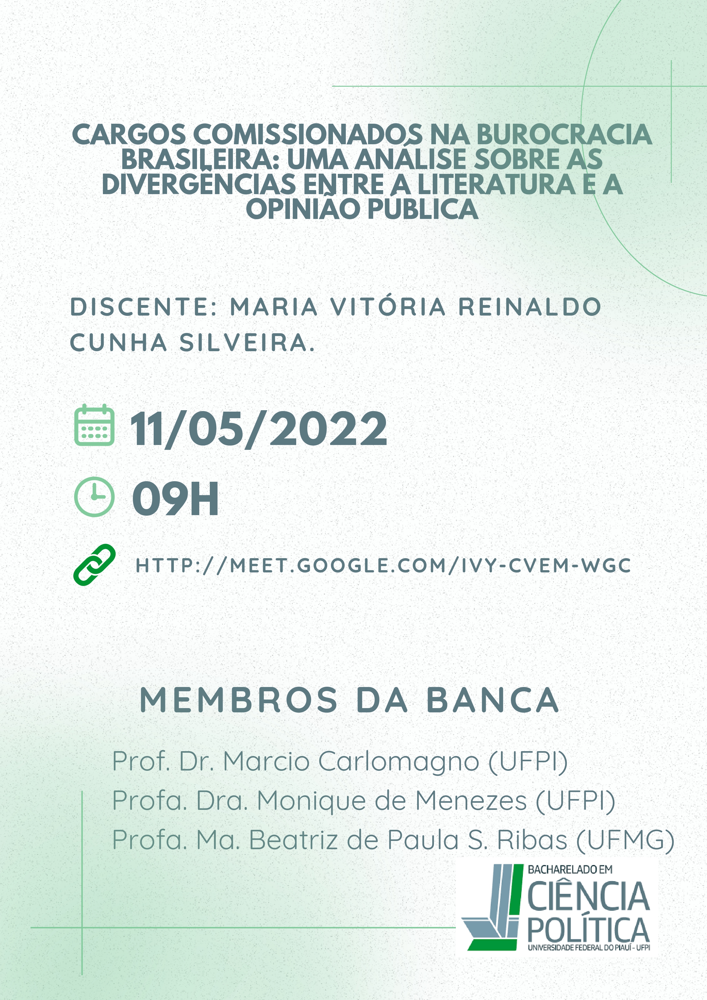 A Coordenação do Curso de Bacharelado em Ciência Política comunica a defesa pública do Trabalho de Conclusão de Curso – TCC, intitulado: “CARGOS COMISSIONADOS NA BUROCRACIA BRASILEIRA: UMA ANÁLISE SOBRE AS DIVERGÊNCIAS ENTRE A LITERATURA E A OPINIÃO PÚBLICA”da Discente: MARIA VITÓRIA REINALDO CUNHA SILVEIRA, sob orientação do Professor Dr. Márcio Cunha Carlomagno – UFPI, a ser realizada no dia 11/05/2022 às 09:00h, via plataforma online do Google meets, link: http://meet.google.com/ivy-cvem-wgc, com os seguintes membros avaliadores: Professora Dra. Monique de Menezes – UFPI e a Professora Ma. Beatriz de Paulo Silva Ribas – UFMG.