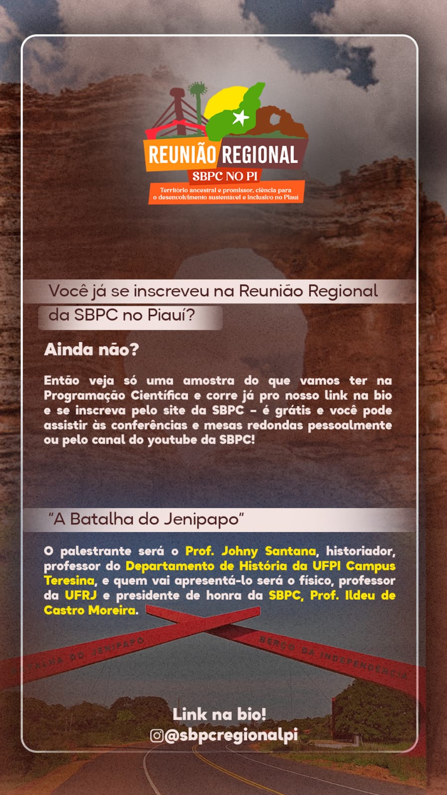 Nos dias 13, 14 e 15 de março de 2023 a Reunião Regional da SBPC será no Piauí com o tema Território Ancestral e Promissor: ciência para o desenvolvimento sustentável e inclusivo no Piauí. Cerca de 50 pesquisadores de todo o país vão se juntar aos piauienses em uma programação extensa.