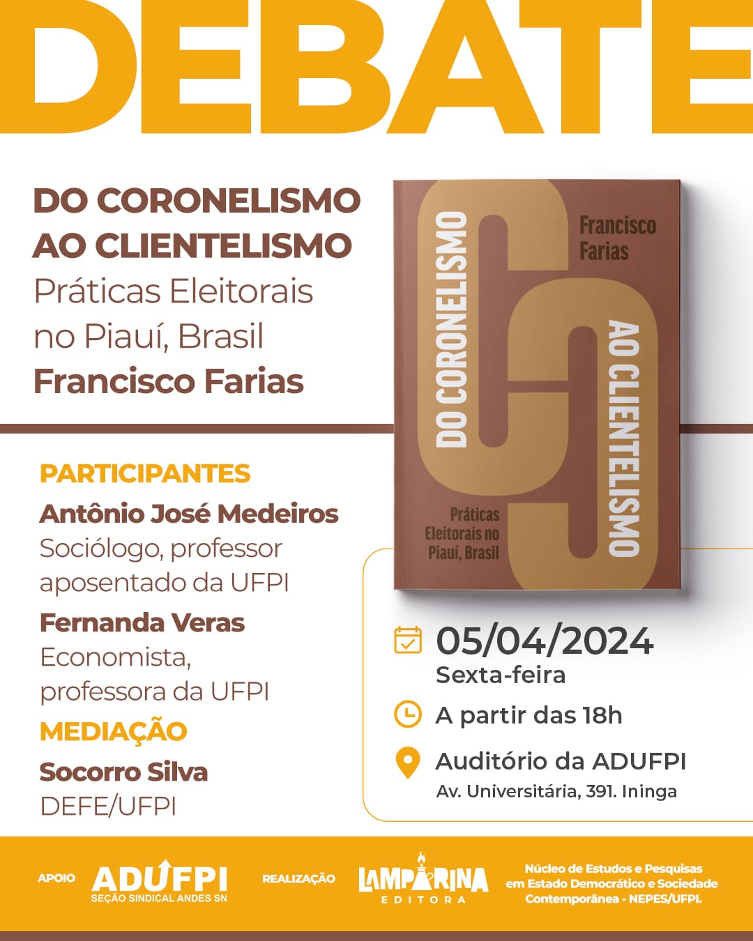 Convidamos todos os discentes a participarem do debate " Do coronelismo ao clientelismo" a fim de enriquecermos o debate da eleição de políticas eleitorais no Piauí.