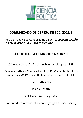 A Coordenação do curso de Ciência Política, por meio desta, divulga a data e horário da banca de TCC do discente Tiago Rangel Dos Santos Nascimento, período letivo 2025.1.