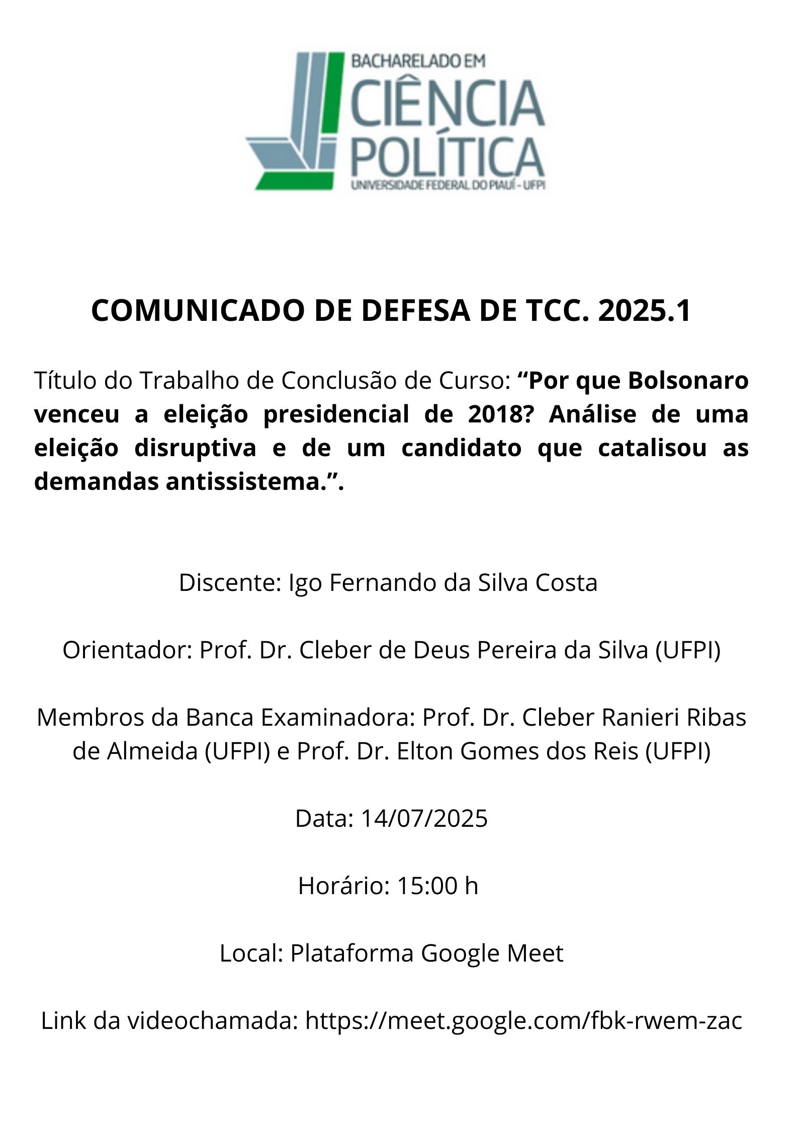 A Coordenação do curso de Ciência Política, por meio desta, divulga a data e horário da banca de TCC do discente Igo Fernando da Silva Costa, período letivo 2025.1.