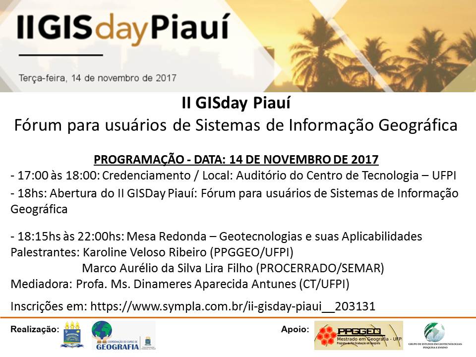 A Universidade Federal do Piauí (UFPI), por meio da Coordenação do Curso de Geografia (CCHL), em parceria com o Curso de Engenharia Cartográfica e de Agrimensura (CT), convidam toda comunidade acadêmica para o II GISday Piauí. O intuito do evento é contemplar uma versão local do fórum internacional (GISday) voltado para usuários de Sistemas de Informação Geográfica (SIG).