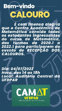 O centro acadêmico do curso de Matemática, CAMAT, realizará uma recepção e acolhimento aos estudantes do curso, em especial aos discentes que ingressaram na UFDPar entre 2020.1 e 2022.1. Veja abaixo o dia e local: