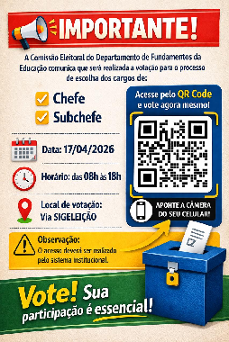 A Comissão Eleitoral do Departamento de Fundamentos da Educação comunica que será realizada a votação para o processo de escolha dos cargos de Chefe e Subchefe para o Biênio 2026/2028.