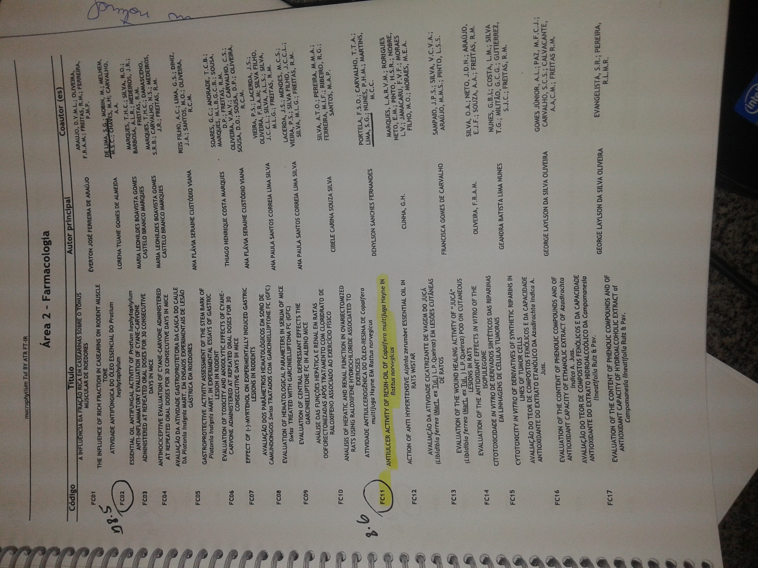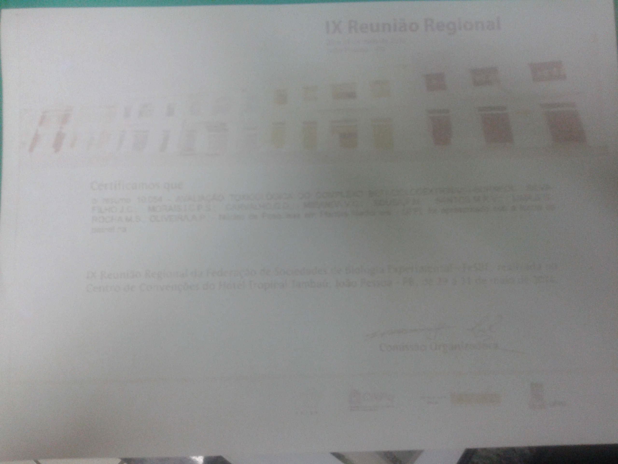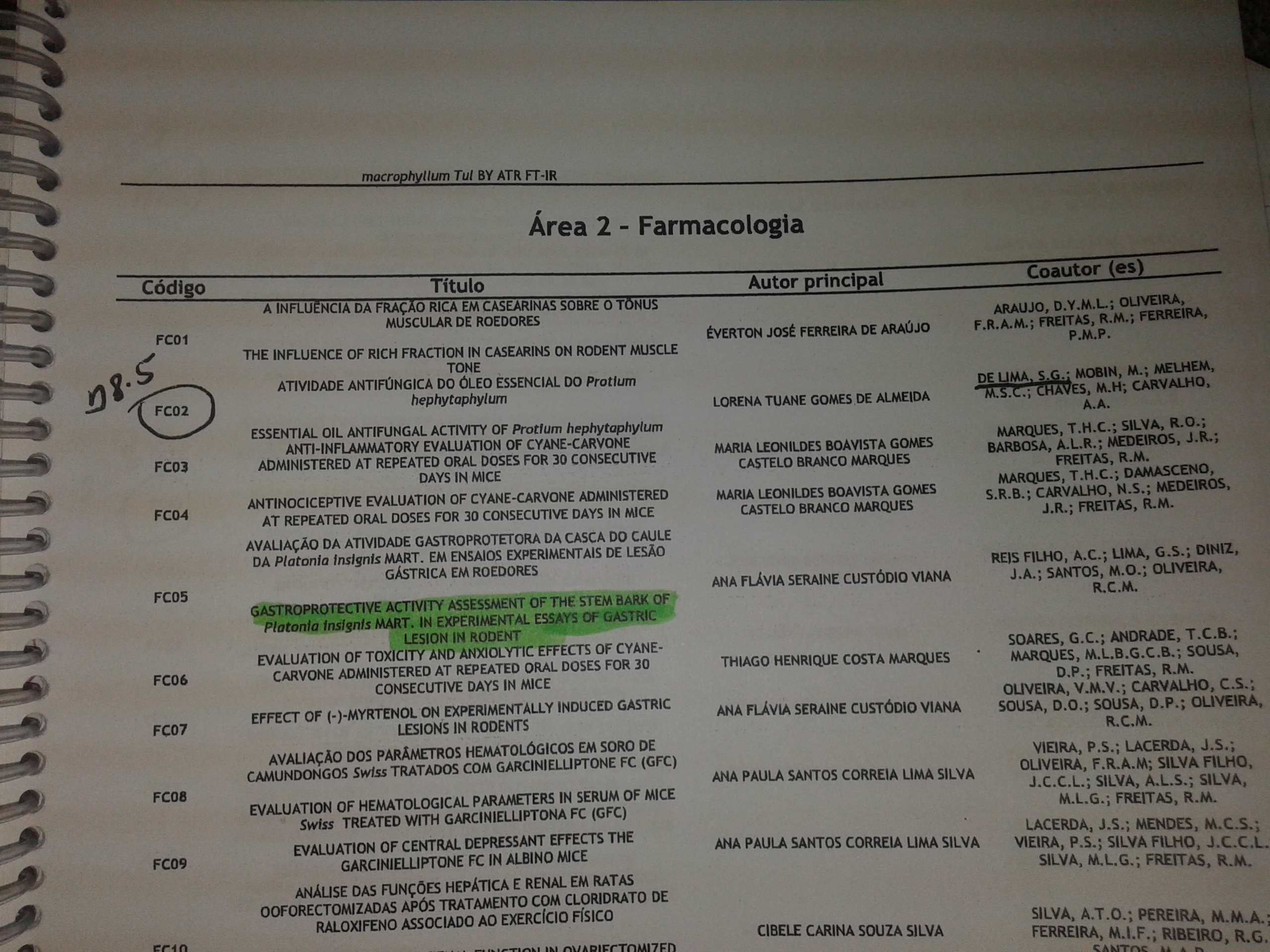 2013, FERNANDES, D.S., PORTELA, F.S.O., CARVALHO, T.T.A., Sidney Gonçalo de Lima, NUNES, P.H.M., MARTINS, M.C.C., ANTIULCER ACTIVITY OF RESIN-OIL OF Copaifera multijuga Hayne IN Rattus Norvegicus, I Encontro Estratégico em Ciências Farmacêuticas/ I Seminário Ibero Americano de P&D de Medicamentos., Trabalho Completo
