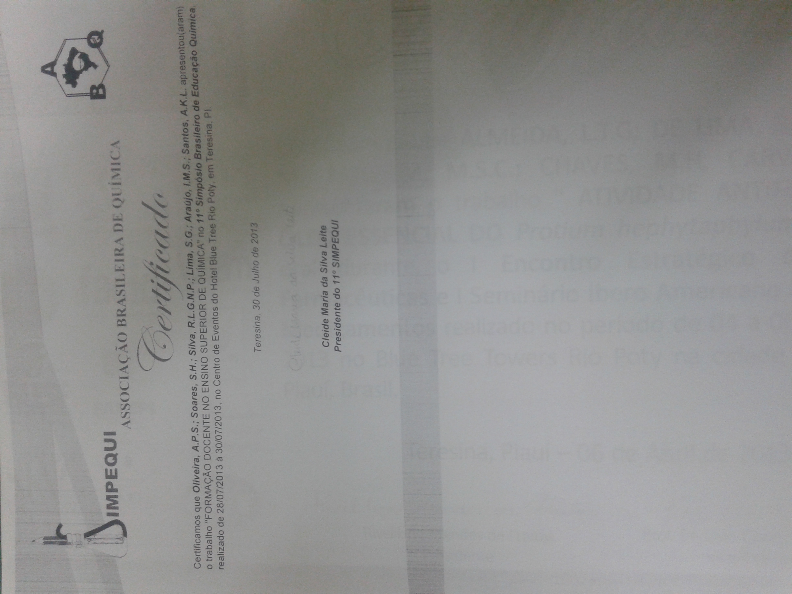 LAGO, E. C. ; De Lima, S. G. ; Davi da Silva ; Antônia M. G. Lopes Citó ; Lopes, J.A.D. ; PEREIRA, S. T. ; NUNES, L. C. C.