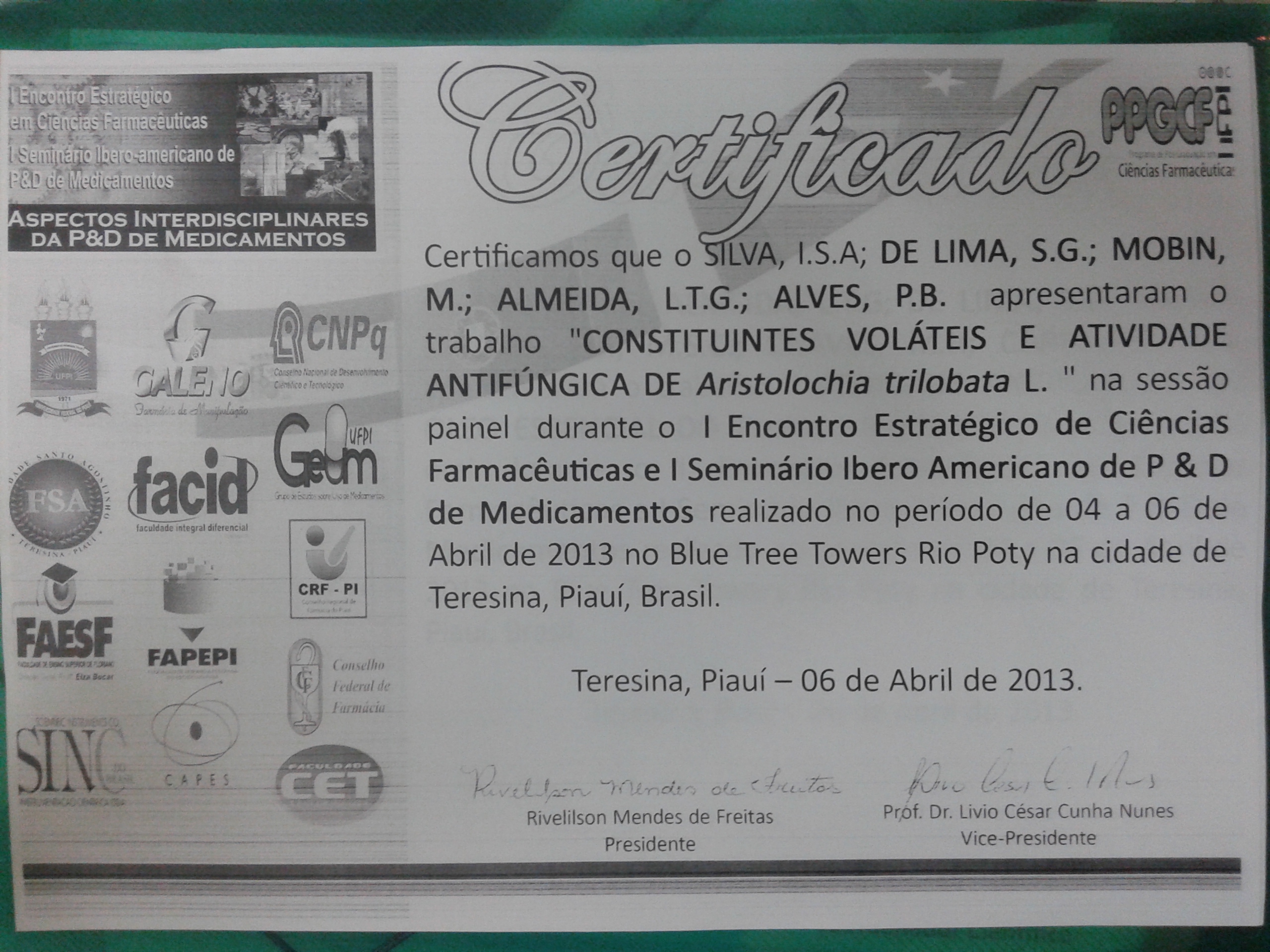 2013, Iara S. A. Silva, Sidney Gonçalo de Lima, MITRA MOBIM, LORENA TUANE G. ALMEIDA, Péricles Barreto Alves, VOLATILE CONSTITUENTS AND ANTIFUNGAL ACTIVITY OF ARISTOLOCHIA TRILOBATA L, I Encontro Estratégico em Ciências Farmacêuticas/ I Seminário Ibero Americano de P&D de Medicamentos., Trabalho Completo