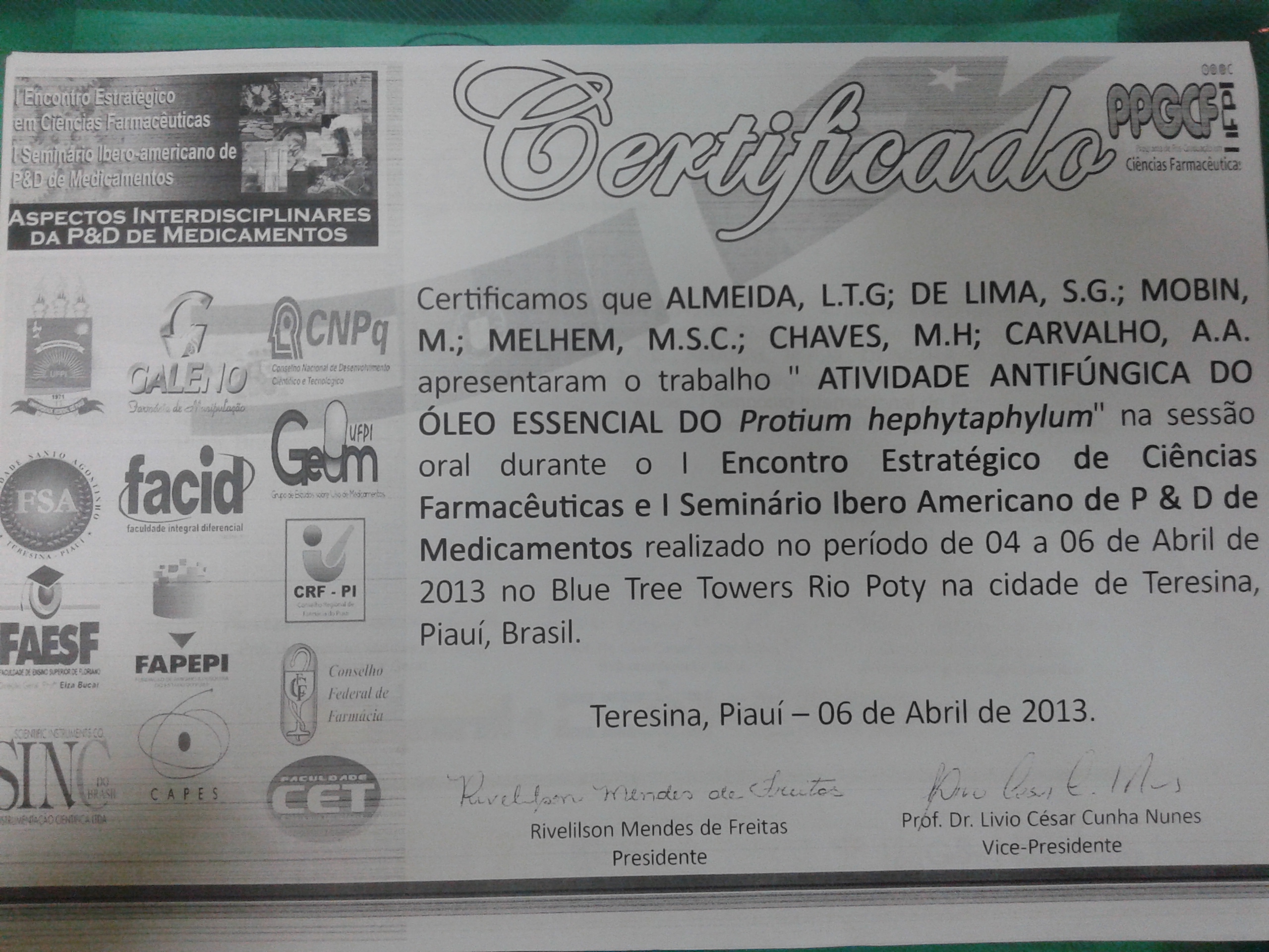 2013, LORENA TUANE G. ALMEIDA, Sidney Gonçalo de Lima, MITRA MOBIM, MELHEM, M.S.C, ATIVIDADE ANTIFÚNGICA DO ÓLEO ESSENCIAL DO Protium hephytaphylum (ESSENTIAL OIL ANTIFUNGAL ACTIVITY of Protium hephytaphylum), I Encontro Estratégico em Ciências Farmacêuticas e o I Seminário Ibero Americano de P &D de Medicamentos., Resumo