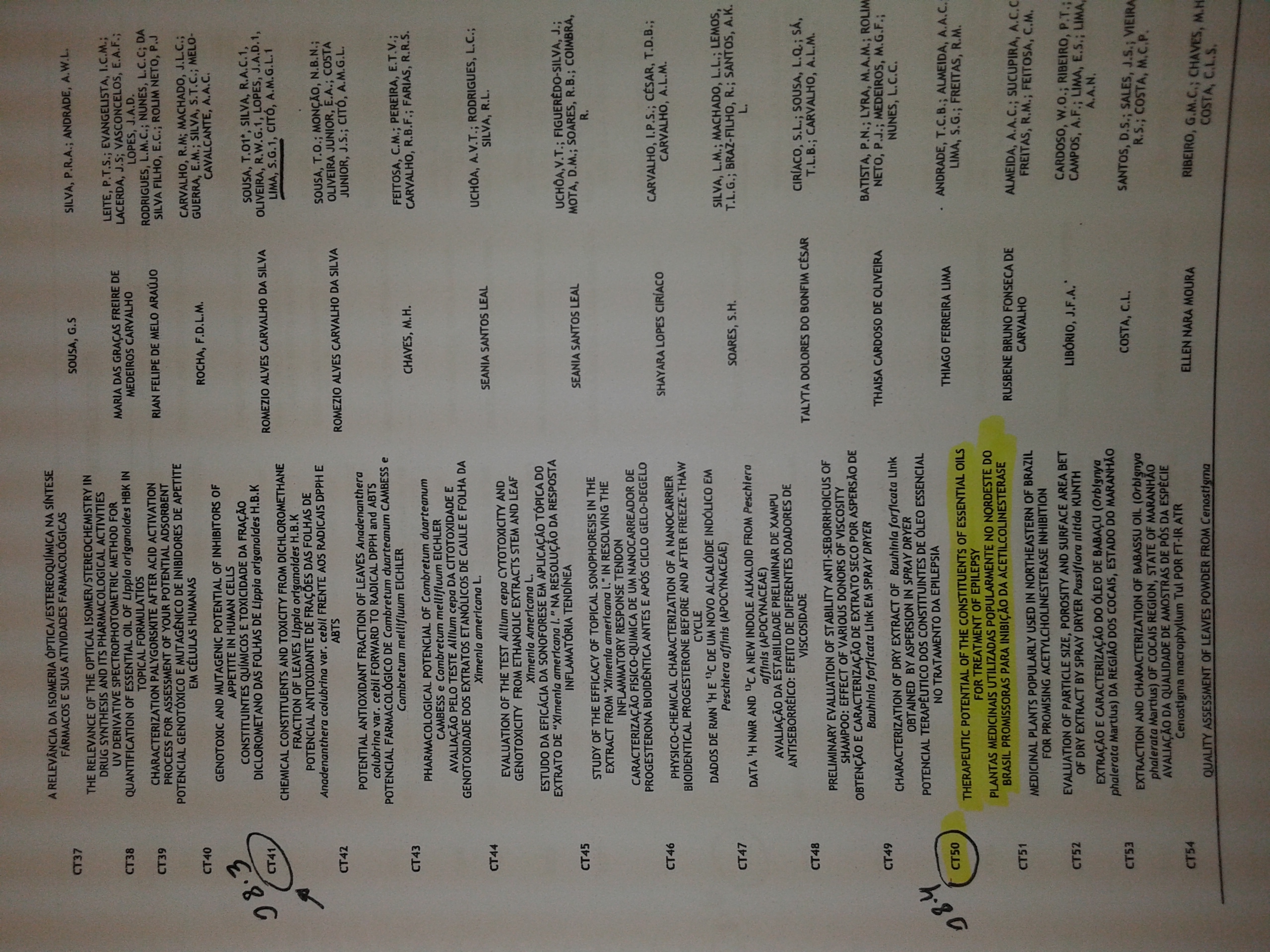2013, Citó, A. M. G. L., Sidney Gonçalo de Lima, BARROS, E.D.S., MOURA, A.K.S., CHEMICAL CONSTITUENTS OF WAX AND PROPOLIS OF Apis mellifera PRODUCED IN THE MICROREGION OF PICOS ? PI, I Encontro Estratégico em Ciências Farmacêuticas/ I Seminário Ibero Americano de P&D de Medicamentos., Trabalho Completo