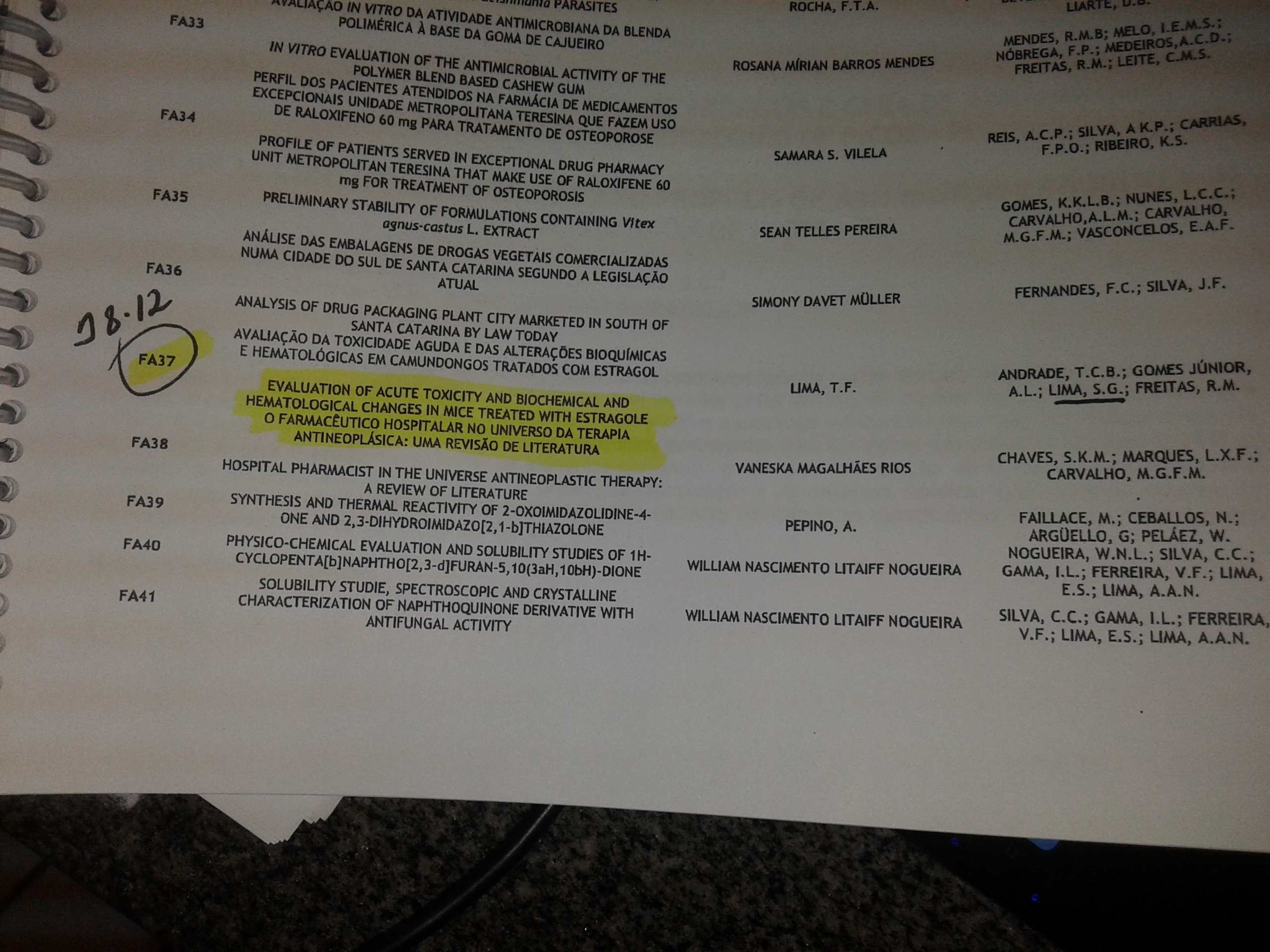 2013, LIMA, T.F., ANDRADE, T.C.B., GOMES JUNIOR, A.L., Sidney Gonçalo de Lima, Rivelilson Mendes de Freitas, EVALUATION OF ACUTE TOXICITY AND BIOCHEMICAL AND HEMATOLOGICAL CHANGES IN MICE TREATED WITH ESTRAGOLE, I Encontro Estratégico em Ciências Farmacêuticas e o I Seminário Ibero Americano de P &D de Medicamentos. In: BOLETIM INFORMATIVO GEUM. Teresina, PI, 2012. Volume 4, número 2, suplemento 1, mar-abr de 2013, Resumo
