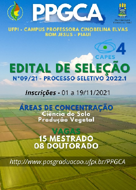 A Universidade Federal do Piauí (UFPI), por meio da Pró-Reitoria de Ensino de Pós-Graduação (PRPG), do Diretor do Campus Profª. Cinobelina Elvas (CPCE) e da Coordenação do Programa de Pós-Graduação em Ciências Agrárias (PPGCA) da Universidade Federal do Piauí, no uso de suas atribuições, torna pública a abertura das inscrições à seleção de candidatos ao Programa de Pós-Graduação em Ciências Agrárias para ingresso em 2022.1.