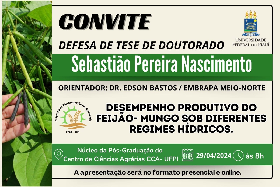 O Programa de Pós-graduação em Agronomia, convida a Comunidade Universitária para assistir a Defesa de tese de Doutorado de Sebastião Pereira do Nascimento, intitulada: "DESEMPENHO PRODUTIVO DE LINHAGENS DE FEIJÃOMUNGO SOB DIFERENTES LÂMINAS DE IRRIGAÇÃO", a ser realizada no Auditório da Pós-graduação / CCA.