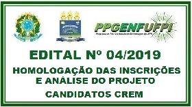 A Universidade Federal do Piauí, por meio da Pró-Reitoria de Ensino de Pós-Graduação (PRPG), divulga o resultado da homologação das inscrições e do resultado da análise do Projeto dos candidatos do CREM, referente ao Edital Nº 04/2019 - Processo Seletivo para o Programa de Pós-Graduação em Enfermagem (PPGEnf).