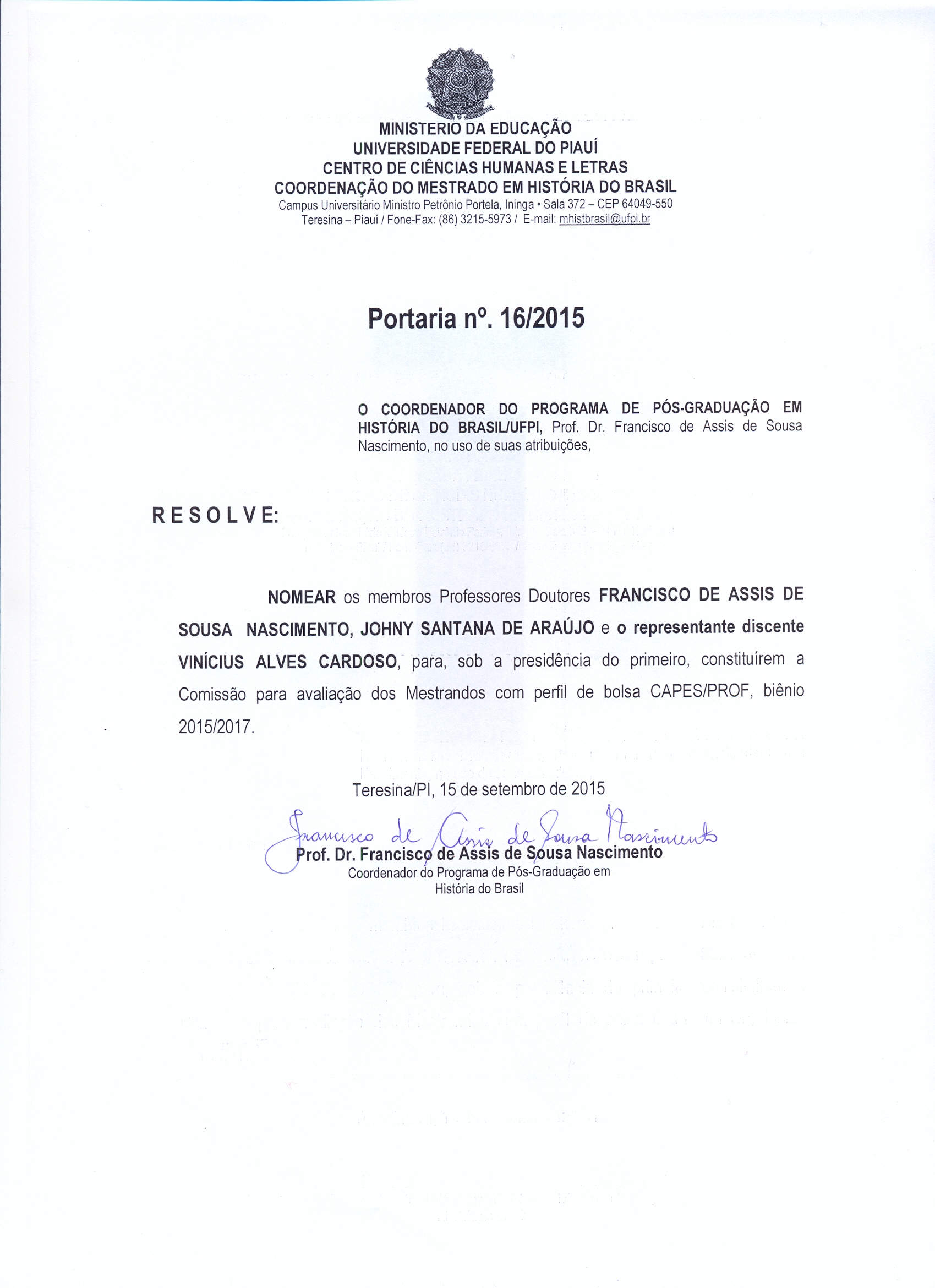 Portaria Nº 16 Comissão de Bolsa CAPES/PROF, biênio 2015/2017