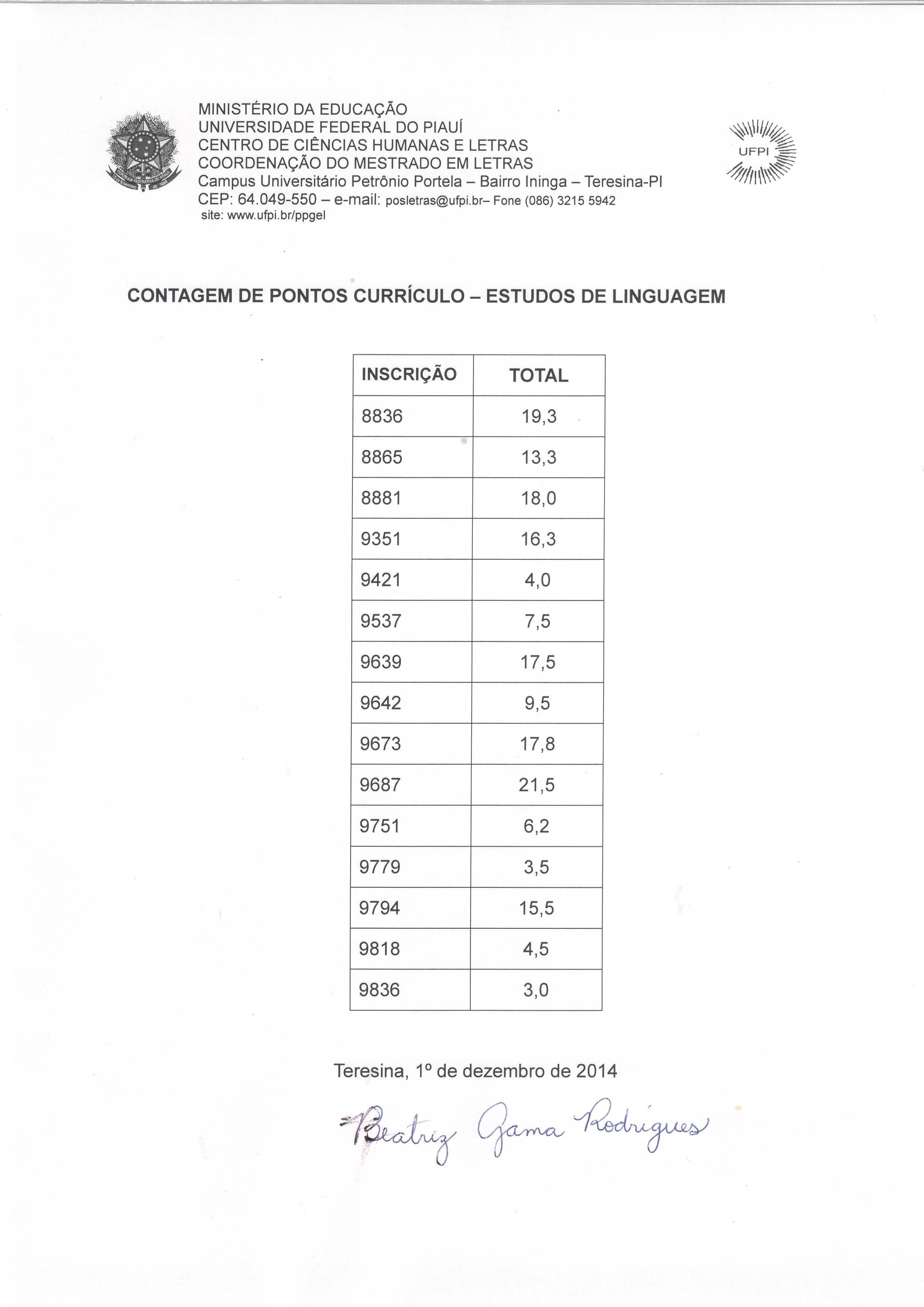 RESULTADO PROVA DE TÍTULOS ESTUDOS DE LINGUAGEM - SELEÇÃO BIÊNIO 2015 - 2017.