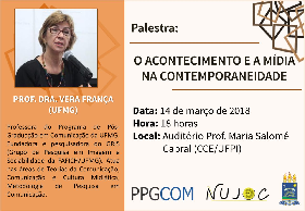 A Universidade Federal do Piauí, por meio do Programa de Pós-Graduação em Comunicação (PPGCOM), convida toda a comunidade para a palestra “O Acontecimento e a Mídia na contemporaneidade” proferida pela Profa. Dra. Vera França do Programa de Pós-Graduação da Universidade Federal de Minas Gerais (UFMG).