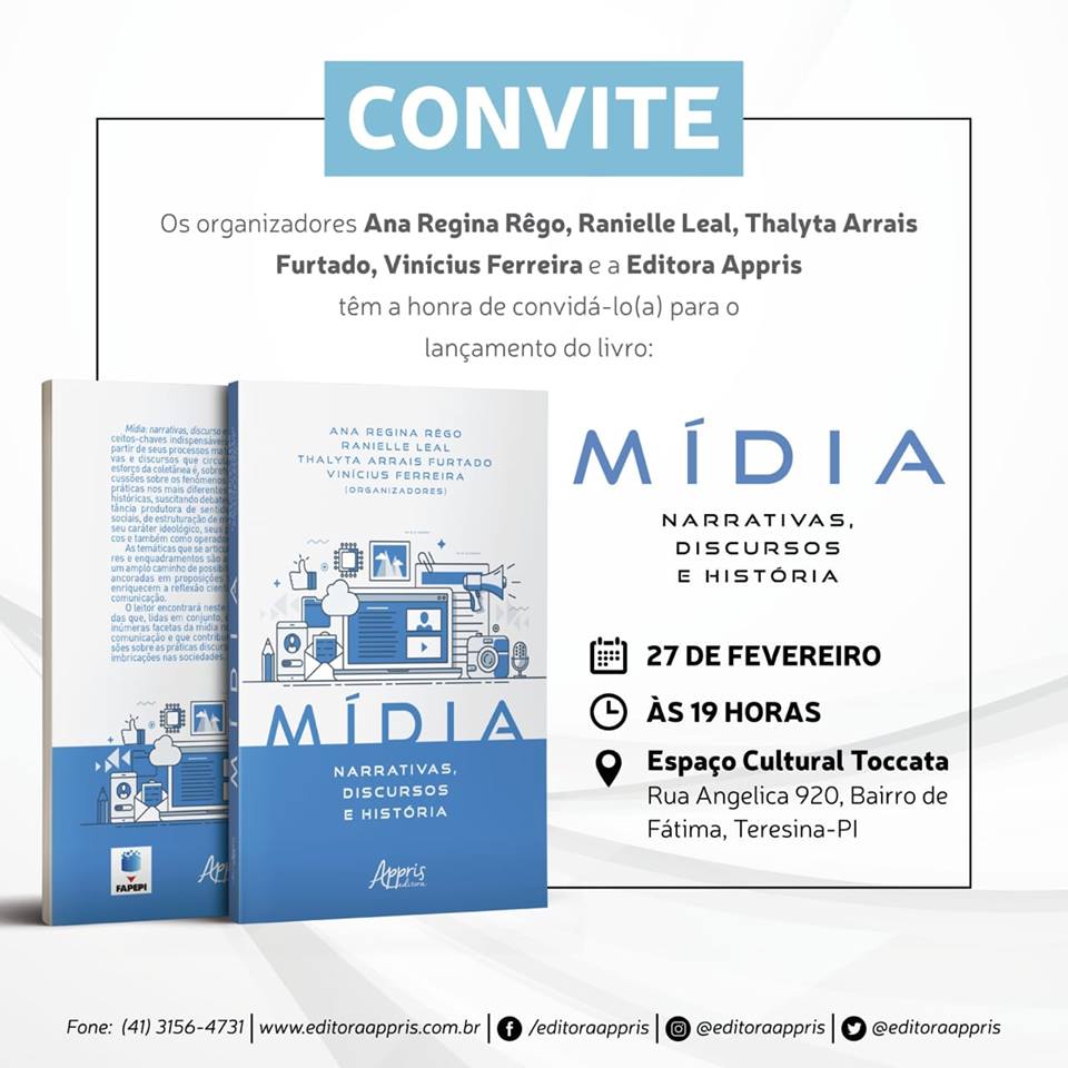 O Programa de Pós-Graduação em Comunicação da Universidade Federal do Piaúí convida a todos e a todas a se fazerem presentes no lançamento do livro "Mídia: Narrativas, Discursos e História", que acontecerá nesta quarta-feira, 27 de fevereiro de 2019, a partir das 19h00min, no Espaço Cultural Toccata.