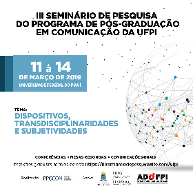 A Universidade Federal do Piauí (UFPI), por meio do Programa de Pós-Graduação em Comunicação (PPGCOM), convida a comunidade acadêmica para participar do “III Seminário de Pesquisa do PPGCOM/UFPI” que será realizado nos dias 11 a 14 de março de 2019, no Centro de Ciências da Educação (CCE/UFPI), com o tema “Dispositivos, Transdisciplinaridades e Subjetividades”.