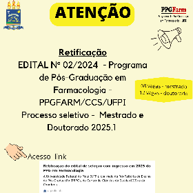 A Universidade Federal do Piauí (UFPI), por meio da Pró-Reitoria de Ensino de Pós-Graduação (PRPG), do Centro de Ciências da Saúde (CCS) e da Coordenação do Programa de Pós-Graduação em Farmacologia (PPGFARM), no uso de suas atribuições, torna pública retificação do Edital Nº02/2024 - EDITAL N° 02/ (2024) – Programa de PósGraduação em Farmacologia-PPGFARM/UFPI - Processo seletivo Mestrado e Doutorado – ingresso 2025.1.
