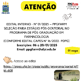 A Coordenação do Programa de Pós-Graduação em Farmacologia (PPGFarm) da UFPI (código do curso: 21001014013P4), considerando a Resolução CEPEX Nº 050/2017, torna público o presente Edital, que estabelece a abertura de inscrições para seleção de 01 (um)(a) candidato(a) para realização de estágio pós-doutoral no PPGFARM/UFPI, conforme Programa de Desenvolvimento da Pós-Graduação – PDPG (Edital CAPES nº 16/2022).