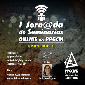 Abertas para o público em geral as inscrições para a 5a. Palestra da I Jornada de Seminários Online do PPGCM a ser realizada todas às quintas, 18 horas, via Webconferência, sendo este próximo Seminário a ser ministrado pela Dra. Pollyana de Aragão Trigueiro, Pós-Doc do PPGCM, cujo título é "Argilas e Argilominerais: Propriedades e Aplicações", dia 18/06/2020.
