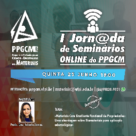 Abertas para o público em geral as inscrições para a 6a. Palestra da I Jornada de Seminários Online do PPGCM a ser realizada todas às quintas, 18 horas, via Webconferência, sendo este próximo Seminário a ser ministrado pela Profa. Dra. Rafaela Luiz Pereira Santos, docente do PPGCM, cujo título é "Materiais com Gradiente Funcional de Propriedades: Uma Abordagem sobre Biomateriais para Aplicação Odontológica", dia 25/06/2020.