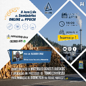 Abertas para o público em geral as inscrições para a 4a. Palestra da II Jornada de Seminários Online do PPGCM, a ser ministrada pelo Prof. Dr. Glauber Cruz (UFMA), cujo título é "Caracterização de materiais lignocelulósicos e aplicação em processos de termoconversão para produção de bioenergia na região Nordeste", a ser realizada na próxima quarta-feira, às 18 horas, via Live do Youtube, dia 27/10/2021.