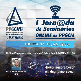 Abertas para o público em geral as inscrições para a 11a. Palestra da I Jornada de Seminários Online do PPGCM a ser realizada na próxima quinta, às 18 horas, via Web conferência e Youtube, sendo este Seminário ministrado pelo Prof. Dr. Eduardo Costa Girão, docente do PPGCM, cujo título é "Novos Nanocarbonos em Duas Dimensões", dia 30/07/2020.