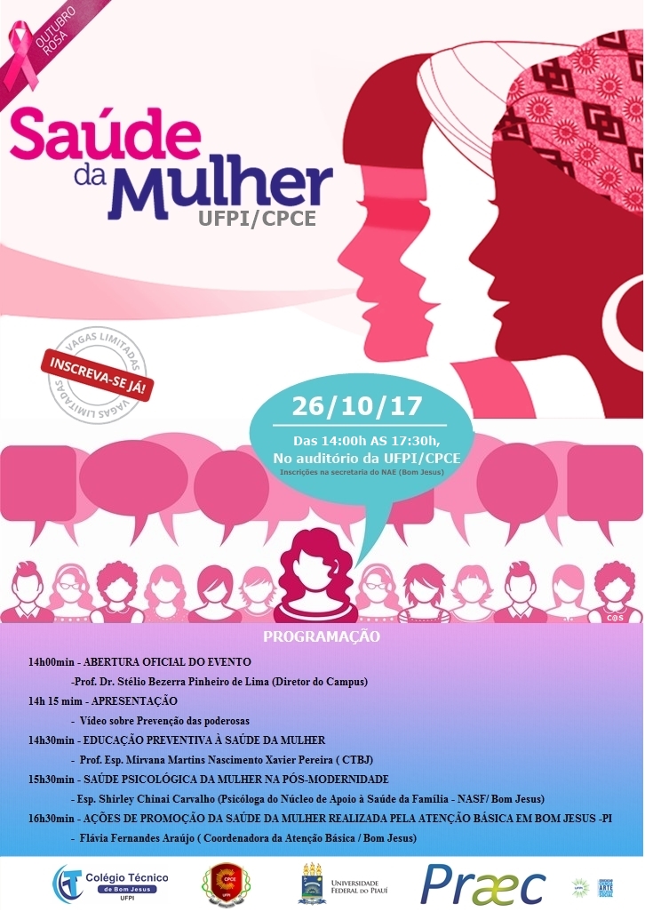 A Universidade Federal do Piauí, por meio da Pró-Reitoria de Assuntos Estudantis e Comunitários (UFPI/PRAEC), do Núcleo de Assistência Estudantil (NAE) – Campus Professora Cinobelina Elvas (Bom Jesus) promove, no auditório do Campus Professora Cinobelina Elvas – CPCE, no dia 26 de outubro de 2017, palestra sobre saúde da mulher. Direcionada a servidores e alunos da UFPI e do Colégio Técnico de Bom Jesus (CTBJ), além da comunidade em geral.