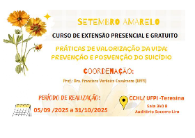 Em alusão à campanha Setembro Amarelo, o Grupo de Pesquisa Transdisciplinar sobre Corpo, Saúde e Emoções (Corpo Trans) da Universidade Federal do Piauí (UFPI) realiza o curso de extensão Práticas de Valorização da Vida: Prevenção e Posvenção do Suicídio, coordenado pela professora Francisca Verônica Cavalcante. As inscrições estão abertas e devem ser feitas por meio de formulário eletrônico.