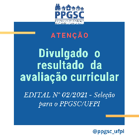 O Programa de Pós-Graduação em Saúde e Comunidade divulga o resultado da Etapa IV (currículo), referente ao processo seletivo regido pelo edital N.º 02/2021 - PPGSC/UFPI.