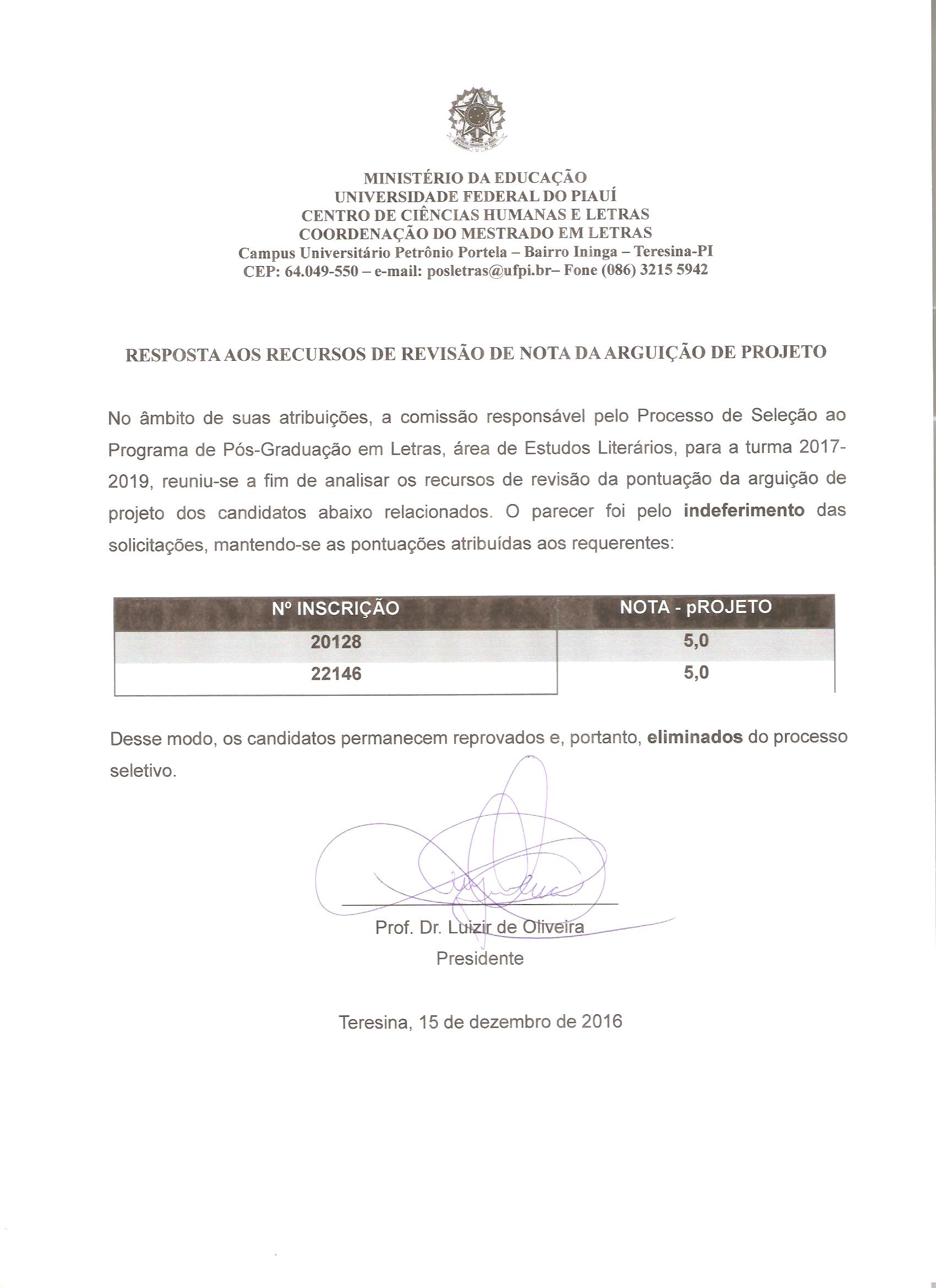 RESULTADO RECURSO ARGUIÇÃO - LITERATURA
