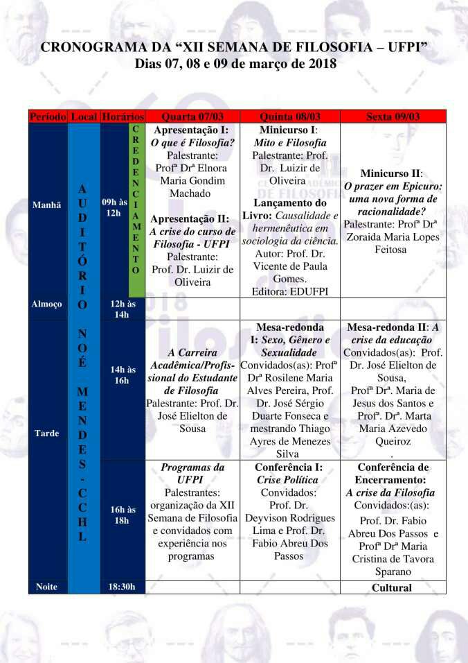 Na próxima semana, entre os dias 7 e 9, teremos a XII Semana da Filosofia. Anexo segue o cronograma com todas as atividades. Teremos mesas redondas, palestras, minicursos e também o lançamento do livro do Professor Vicente!