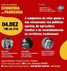 O Departamento de Ciências Econômicas e Quantitativas da UFDPar estará realizando, nesta sexta-feira (04/12/2020), o XII Seminário temático do Curso de Extensão Economia na Pandemia, com o tema A conjuntura de crise global e dos retrocessos nas políticas agrária, de agricultura familiar e de reconhecimento de território tradicionais. Os convidados são: Profa. Ma. Hana Rosa (UFDPar); Prof. Dra. Alyne Sousa (IFPI) e Prof. Dr. João Paulo Macedo (UFDPar).