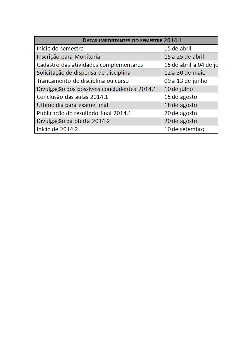 Fiquem atentos ao calendário acadêmico de 2014.1. Confira nesta publicação algumas datas importantes do semestre.