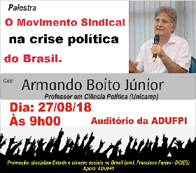 No próximo dia 27/08, às 9:00h, no Auditório da Adufpi, acontece a palestra "O movimento sindical na crise política do Brasil", com o professor Armando Boito Junior. O evento faz parte das atividades da disciplina "Estado e classes sociais no Brasil", ministrada pelo professor Francisco Farias.