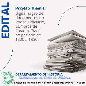 A Coordenação do Núcleo de Pesquisa em História e Memória do Piauí (NUPEM), vinculada ao Departamento de História do Centro de Ciências Humanas e Letras da Universidade Federal do Piauí (UFPI), por meio deste Edital, torna público aos alunos de graduação e interessados a participarem do projeto de extensão  Themis: digitalização de documentos do Poder Judiciário, Comarca de Castelo, Piauí, no período de 1800 a 1950, de acordo com disposto no Edital  n° 1/2024 NUPEM/UFPI, de 26 de março de 2024, seleção com 4 (quatro) vagas para extensionistas voluntários, com a finalidade de desenvolverem as  atividades do NUPEM.