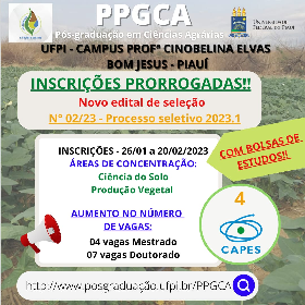A Universidade Federal do Piauí (UFPI), por meio da Pró-Reitoria de Ensino de Pós-Graduação (PRPG), da Diretoria do Campus Professora Cinobelina Elvas (CPCE) e da Coordenação do Programa de Pós-Graduação em Ciências Agrárias (PPGCA), torna público o aditamento ao Edital PPGCA/UFPI N.º 02, de 24 de janeiro de 2023.