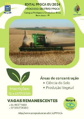 A Universidade Federal do Piauí (UFPI), por meio da Pró-Reitoria de Ensino de Pós-Graduação (PRPG), da Diretoria do Campus Professora Cinobelina Elvas (CPCE) e da Coordenação do Programa de Pós-Graduação em Ciências Agrárias (PPGCA), no uso de suas atribuições, torna pública para conhecimento dos interessados a abertura das inscrições e realização de seleção para preenchimento de 04 (quatro) vagas para o Curso de Mestrado e 02 (duas) vagas para o Curso de Doutorado, totalizando 06 (seis) vagas, distribuídas em duas áreas de concentração: 1 - Ciência do Solo e 2 - Produção Vegetal, conforme discriminado no ANEXO IV do Edital.