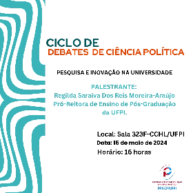 A Coordenação do Programa de Pós-Graduação em Ciência Política da UFPI tem a honra de convidar todos os interessados para participar do Ciclo de Debates de Ciência Política, que contará com a palestra intitulada "Pesquisa e Inovação na Universidade". A palestrante será a Profa. Dra. Regilda Saraiva dos Reis Moreira-Araújo, Pró-Reitora de Ensino de Pós-Graduação da UFPI.