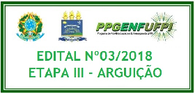A Universidade Federal do Piauí (UFPI), por meio da Pró-Reitoria de Ensino de Pós-Graduação (PRPG), torna pública a relação das inscrições de candidatos para a Etapa III - Arguição Oral a ser realizada no dia 23 de novembro de 2018 na Sala de Aula 1 do Programa de Pós-Graduação em Enfermagem da UFPI - Bloco SG12 Campus Ministro Petrônio Portela,próximo ao Departamento de Enfermagem.