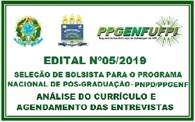 A Universidade Federal do Piauí (UFPI), por meio da Pró-Reitoria de Ensino de Pós-Graduação (PRPG), do Centro de Ciências da Saúde (CCS) e da Coordenação do Programa de Pós-Graduação em Enfermagem (PPGEnf), torna público o resultado da análise de currículo e agendamento das entrevistas - EDITAL Nº 05/2019 - PPGENF/CCS/UFPI - Seleção de Bolsista para o Programa Nacional de Pós-Graduação-PNPD do Programa de Pós-Graduação em Enfermagem - PPGENF - (PNPD 2019/CAPES).