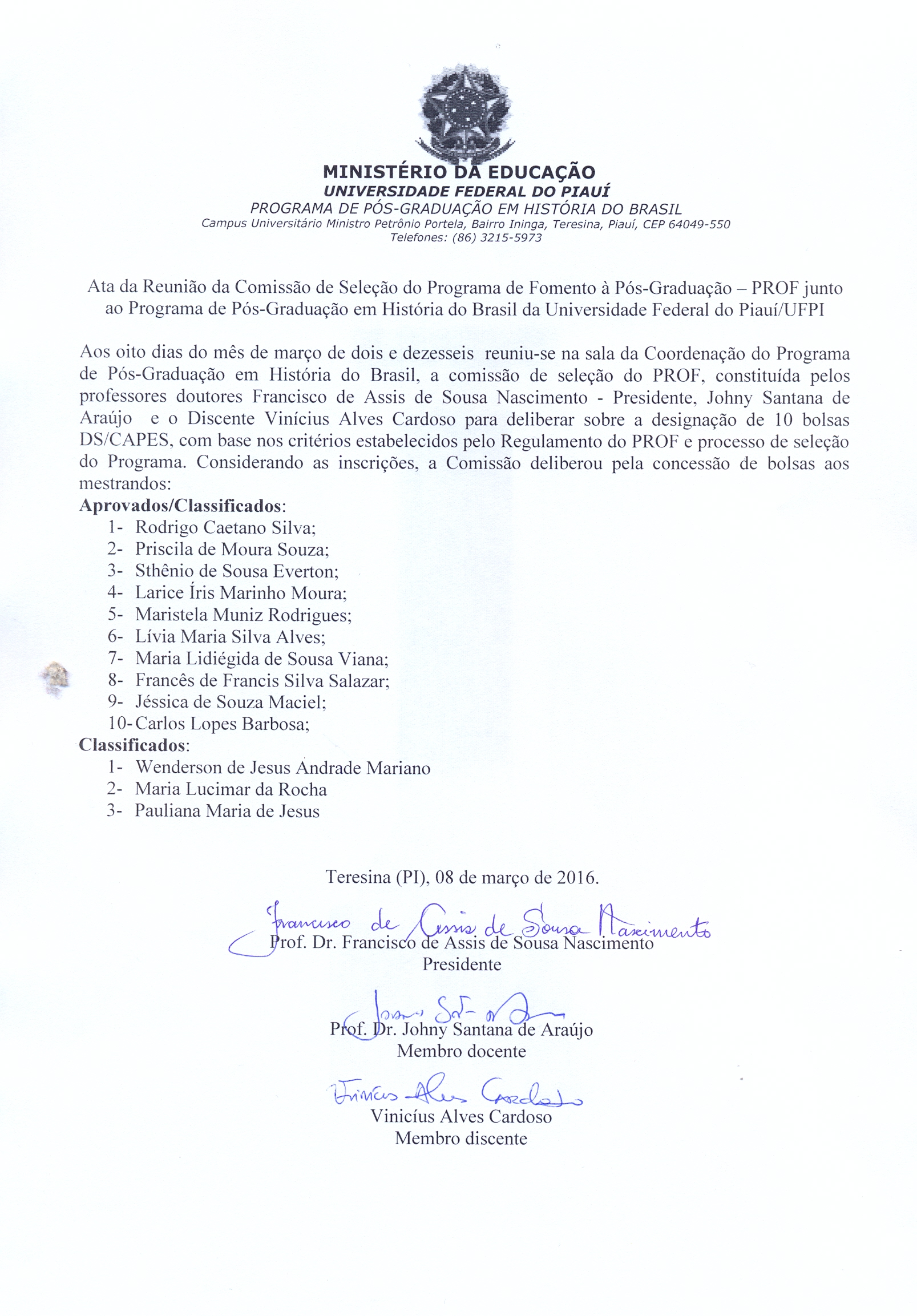 Resultado da Seleção do Programa de Fomento à Pós-Graduação -PROF junto ao PPGHB