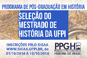 O Coordenador do Programa de Pós-Graduação em História do Brasil – PPGHB, aprovado pela Resolução CEPEX nº 151/03 de 11.09.2003, no uso de suas atribuições, por delegação do Diretor do CCHL, da Universidade Federal do Piauí, através da Pró-Reitoria de Ensino de Pós-Graduação [PRPG], comunica a abertura de inscrições com vistas à seleção de candidatos para ingresso no ano de 2017.