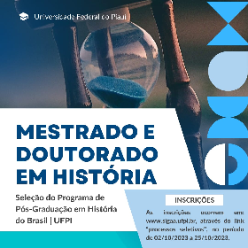 A Universidade Federal do Piauí, por meio da Pró-Reitoria de Ensino de Pós-Graduação [PRPG], do Centro de Ciências Humanas e Letras [CCHL] e da Coordenação do Programa de Pós-Graduação em História, da Universidade Federal do Piauí – UFPI, no uso de suas atribuições, comunica a abertura de inscrições com vistas à seleção de candidatos ao Curso de DOUTORADO e MESTRADO em História para ingresso no ano de 2024.